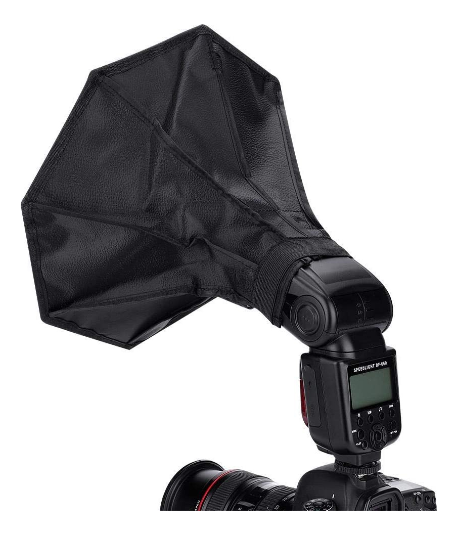 Compatible con cualquier flash Speedlight, este mini softbox transforma la luz intensa del flash en una iluminación suave y difusa. Reduce sombras duras, elimina reflejos molestos y ayuda a evitar el efecto de ojos rojos, logrando fotos más naturales y profesionales.